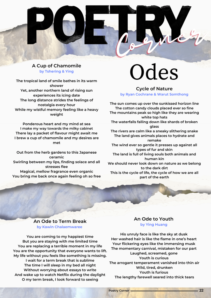 Adventure the poetic world with us! This section showcases how creative thought is put into words through rhymed lines of fixed poems, It is the presentation of our students’ works that delves into various famous and classic poems such as Lyrics, Ode, Haiku, and Limericks. Each poem expresses individuality and style.